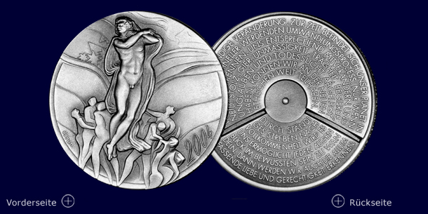 Auf der Vorderseite symbolisiert ein fein modellierter Körper den